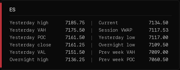 ES opened Globex at 7120.50, ran a tight 27-point range 7109.50 to 7136.25, sitting at 7134.50. Session VWAP at 7117.53. Small giveback from Friday. Coiling right below yesterday’s VAL at 7151.50.