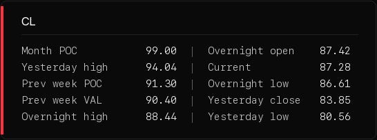 CL: CL is trying to put in a bounce. Hold above 87 and reclaim 88.44 opens prev week VAL 90.40, then prev week POC 91.30 where last week’s volume built. Above 91.30 the air is 93.18 where Friday opened and 94.04 where it failed. Breakdown: below 87 and fail 86.61, revisit is yesterday’s close 83.85, then yesterday’s low 80.56. Below 80.56 there is no reference point.