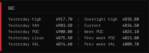 GC: Hold above 4825 week POC and reclaim 4835.80, retest is yesterday’s VAL 4874.60 and close 4875.50. Push through and POC 4900, VAH 4903.50, high 4917.70 are the upside staircase. Break: below 4825 and fail 4815, cascade is 4800.70, then 4797, then last week’s inventory floor.