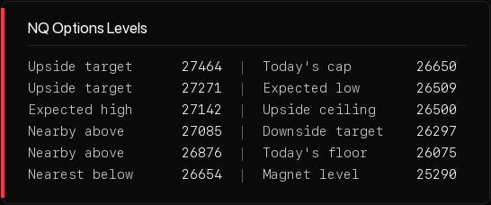 NQ same-day options are skewed call-heavy, today’s cap at 26650, today’s floor at 26075. 30-day expected range 26509-27142. Yesterday’s close was mid-range. Upside targets at 27271 and 27464 if there is a second leg.