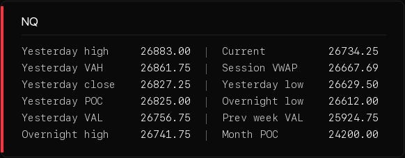 NQ opened at 26675.50, made 26741.75, dipped to 26612, sitting at 26734.25. Session VWAP at 26667.69. Giving back about 90 from yesterday’s POC. The tape is not in a rush to retest the breakout.