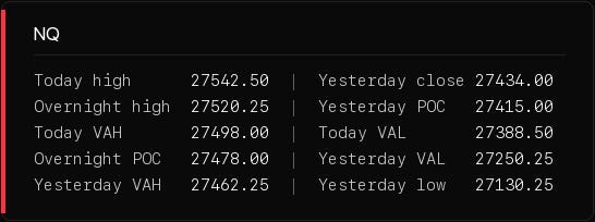 NQ: Above the 27478 overnight POC and reclaim of 27498 Today VAH, the 27542 morning high and 27700 ceiling come back into play. Below 27388 and the 27344 today low fails, 27250 Friday VAL is in play. The streak ends eventually. The 27700 ceiling is the line where any breakout has to fight. Don’t be short into the Wednesday and Thursday Mag7 stack.