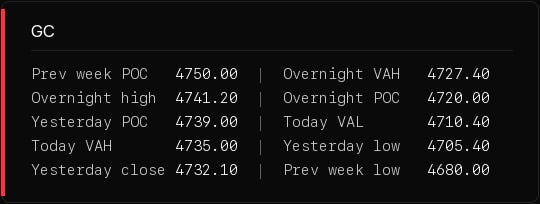 GC opened at 4722.30, ran to 4757.20 in the morning, faded the rest of the session and closed 4732.10. POC 4739, value 4727 to 4750. Friday’s brief said reclaim 4725 for upside and lose 4742 with 4680 next. Gold ran above 4725 to 4757.20 (cleared upside one), then faded back through 4742 to 4705.40 low (triggered downside one) without finishing the 4680 cascade. Distributing all session below the prior week POC at 4750 which has been the line all week.