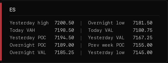 ES opened Globex at 7200.50, traded as low as 7181.50, sitting at 7189.50 right now. Inside Friday’s value, on top of session VWAP at 7191. Overnight POC is 7189 which is right where price is. The market built a tight 20-point box overnight pinned at Friday’s POC. No commitment either direction yet.