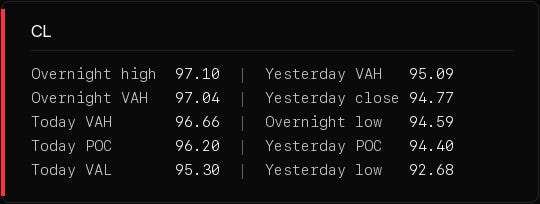 CL opened Globex at 95.58, traded as low as 94.59, ripped to 97.10, currently 95.88. Overnight POC 96.20, full session VAH 96.66. Crude is the wakeup move. Overnight range was 2.51 points which is bigger than entire RTH ranges some days last week.