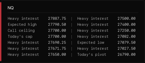 NQ options story. The line in the sand above is the call ceiling at 27700, both standard and same-day. That’s why NQ failed at 27542 this morning. Heavy interest cluster at 27500 is the first wall, 27700 is the second. Today’s pivot is way down at 26790. Below us, heavy interest at 27250 then 27050. Expected high 27790.50, expected low 27079.50. Vol 20.4% with expected daily move 1.3%. Sized for a 350-point day either way.
