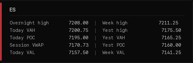 ES is camped right at overnight high stacked under week high 7211.25 in an eleven-handle band. The only thing above is open air toward 7250 then the 7300 zone untouched since the rally. Holds the 7195 / 7200 zone and the upside tilts into 7211 then 7250+. Loses with sellers behind it and 7170 session VWAP / yesterday POC is the first real test, then 7157 today VAL is the line that says the relief rally failed.