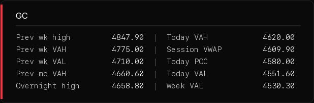 GC is a question of whether the reclaim holds. Above 4609 session VWAP and the bounce extends into 4658 then 4690. Loses 4580 today POC and the V-rally fades back into the value of yesterday’s flush. Gold has been the headline-trust tell all week. Today’s open answers that question for the rest of the week.