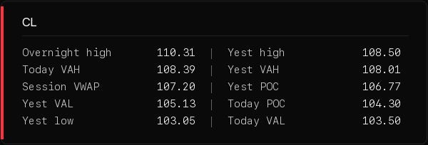 CL is its own animal. Crude said something overnight. 110 was rejected hard. Watching whether 105 holds as support after the round trip. Holds and crude is digesting, not breaking. Loses 103.50 today VAL and the eight-day rip starts unwinding back into 100 round. EIA at 9:30 ignites or kills the move.
