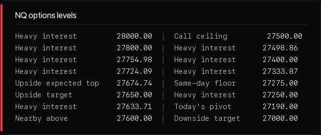 Spot is sitting on the call ceiling 27500 with heavy interest at 27498.86 confirming. Above and 27600 nearby above sets up the stack 27633 / 27650 / 27674 expected top, with the bigger 27724-27800 cluster overhead. Below 27500 and same-day floor 27275 is 230 handles down with the today’s pivot 27190 stacked just below. AAPL tonight breaks the tie.