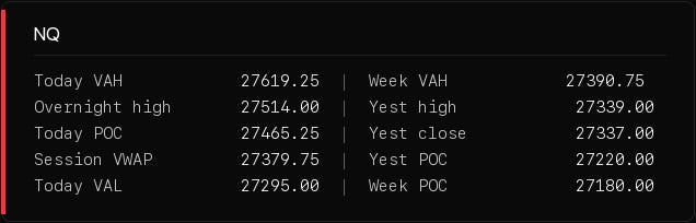 NQ opened Globex 27233.50, dropped to 27185.25, then exploded to 27514 overnight high. Currently 27508.50. Plus 280 from the open. The cloud trio carrying it. Above week VAH 27390 and now testing the 27500 call ceiling stacked with full-session VAH 27619.25 above.
