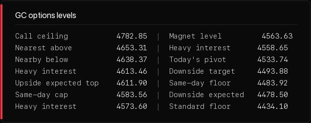 Gold ran above its own upside expected top 4611.90 and through the same-day cap 4583.56 in one Globex session. That’s an outside-range move to the upside. Above price the only structure is 4653 nearest above then the 4782 call ceiling far overhead. Below, the 4583 same-day cap flips to support if the bounce holds, with the magnet 4563 and today’s pivot 4533 stacked. Same-day floor 4483 is the line that says the bounce was a fade.