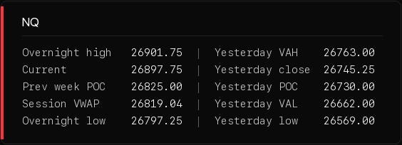 NQ. The 26900 round number. Price tagged 26901.75 overnight, one tick above. If we trade above 26900 into cash open, the next obvious level is 27000. If we roll off 26900 and break below 26800, back in the range and it’s just Monday 2.0.