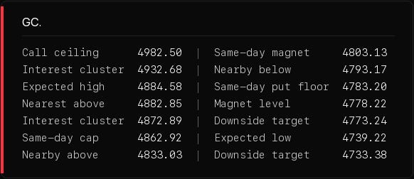 GC. Upside ceiling way up at 4982 (not a level today). Same-day cap 4862 is the real ceiling. Same-day magnet sits at 4803.13, which is why 4811 matters so much, we’re one flush from the pivot. Same-day put floor 4783. Expected range 4739 to 4884. Gold’s long crowd is heavily loaded, and that tends to mean dips get bought until they don’t.