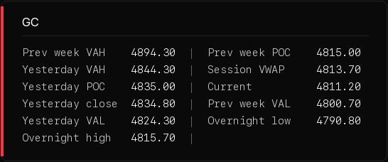 GC. 4811.20 Yesterday Low is the line to the tick. Hold here and buyers come back, first target Session VWAP 4813.70, then Overnight High 4815.70 and Yesterday VAL 4824.30. Above that Yesterday Close 4834.80 and Yesterday POC 4835.00. Break 4811 with sellers and Prev Week VAL 4800.70 is the first step down, then Overnight Low 4790.80 is the cascade. Below 4790 this turns into a different kind of day.