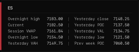 ES. Ripped. Overnight high 7183 hit just under the same-day call ceiling at 7170 which it sliced right through. Low 7154.5 held right on yesterday’s VAH. Net gain 34 points from the cash close. This is the kind of gap that either gets worked off into the open or extends. No clean read yet.