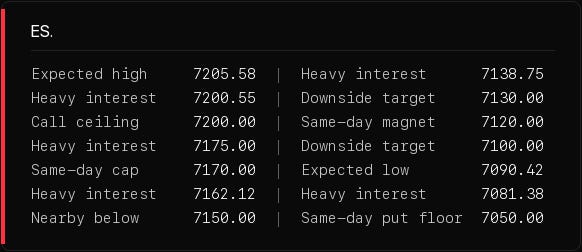 ES. The upside ceiling sits way up at 7200 with the same-day cap at 7170 which we’re already trading above. Standard floor is 6500 which isn’t in play today. Same-day put floor 7050. Expected range 7090 to 7205 and we opened on the top edge of it. The magnet is way down at 7035 but the same-day pivot sits at 7120, which is the more relevant short-term draw. Heavy interest stacks at 7200, 7175, 7162, 7138, 7081. That 7162 to 7138 cluster is the zone that decides whether the gap holds or fills.