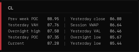 CL. Yesterday POC 87.35 is the pivot. Hold above 87.35 with the 87.58 overnight high as the first target, then Yesterday VAH 87.76 and Prev Week POC 88.95 as the extension. Break 87.35 and lose 87, first stop Session VWAP 86.64, then Yesterday VAL 86.46 and Yesterday Close 86.88. Below that Overnight Low 85.67 and Yesterday Low 85.44. If 85.44 goes, the whole structure from last week is in play.