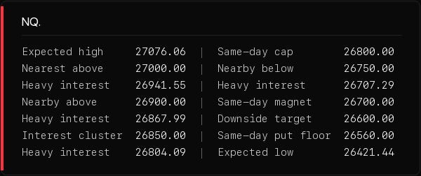 NQ. The full upside ceiling sits down at 26500 and we blew through it weeks ago. Same-day cap 26800. Same-day put floor 26560. Expected range 26421 to 27076 and we’re sitting at 26897.75, right under the top edge. Heavy interest stacks at 26941, 26867, 26804, 26707 and the cluster from 26750 to 26900 is where the fight happens today. Vol reading is elevated relative to the last two months.