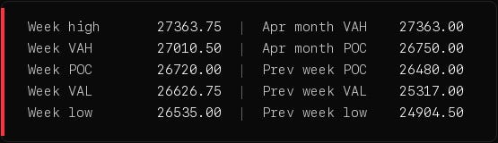 3. NQ 27010 weekly VAH and 26720 weekly POC. Fourteen of fifteen sessions green is a streak that ends. If the earnings reaction sells off, those are the two acceptance levels on the cascade lower.
