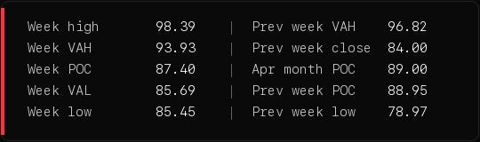 Crude closed Friday at 94.40, sitting right at week VAH and just below the round 100 level that capped the week. Above 98.40 and 100 is the next test, with 105 (last week’s intraday high) as the upside cascade target. Below 93.93 weekly VAH the conversation moves fast back to 87.40 weekly POC, where the bulk of the week’s volume built. Below 85.45 weekly low and 84 prior week close sit inside a dollar of each other. That’s where the war premium fully reverses. Last Friday’s 78.97 low is the floor that matters if 85 fails.