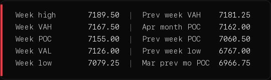 ES has built a new shelf 50 points above last week’s POC and is sitting under the prior week’s all-time high zone. The first real defense is 7126 weekly VAL. Below that, 7079 weekly low and 7060 prior week POC are stacked within 20 points of each other. That’s the line that decides whether the breakout sticks. April POC at 7162 is essentially today’s price. Above 7189 and 7200 is open air, with 7250 as the next round number target.