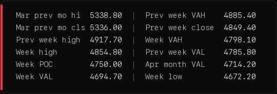 4. GC 4694 weekly VAL. Below it, gold has no volume shelf for a long way down. The cleanest read on FOMC tone in real time Wednesday afternoon.